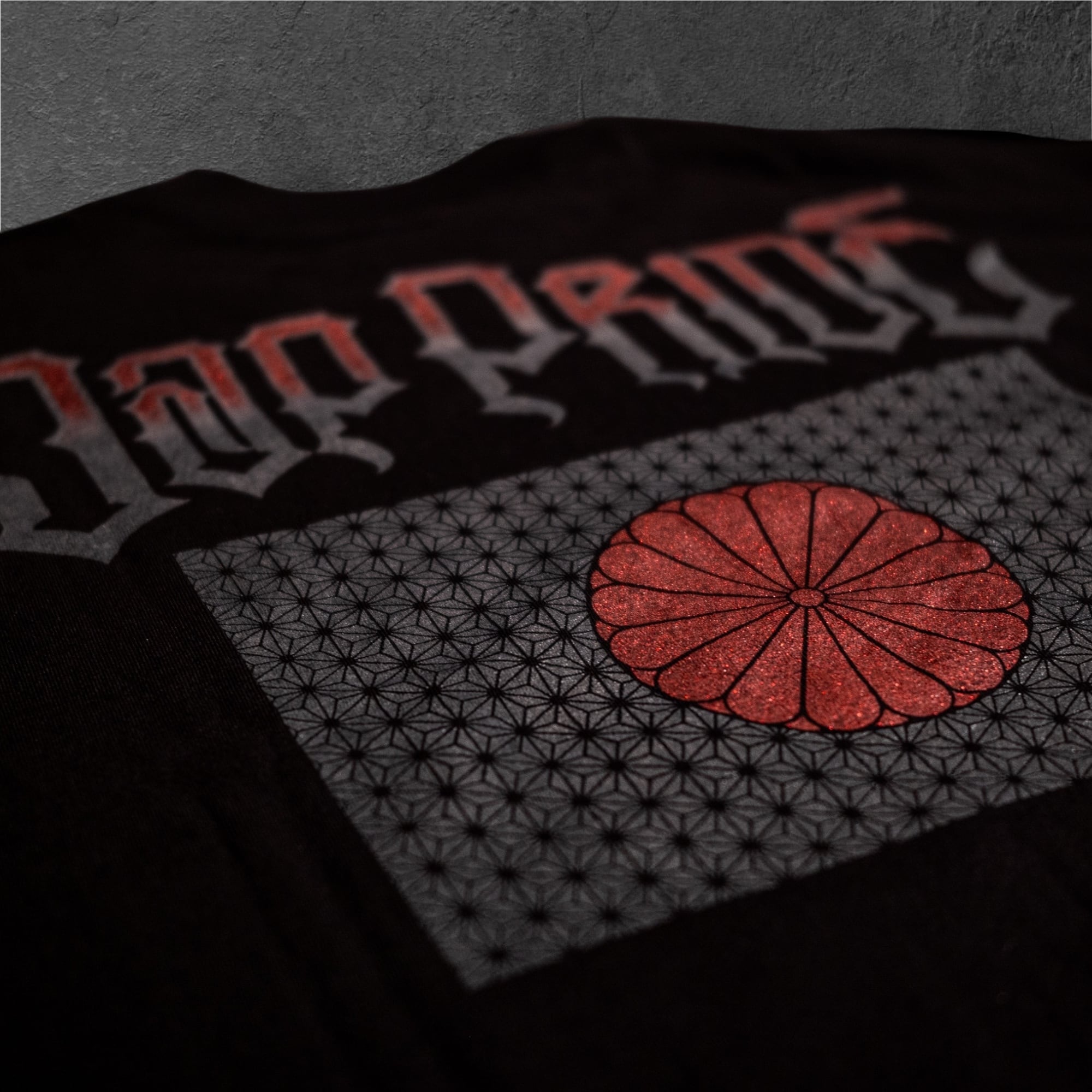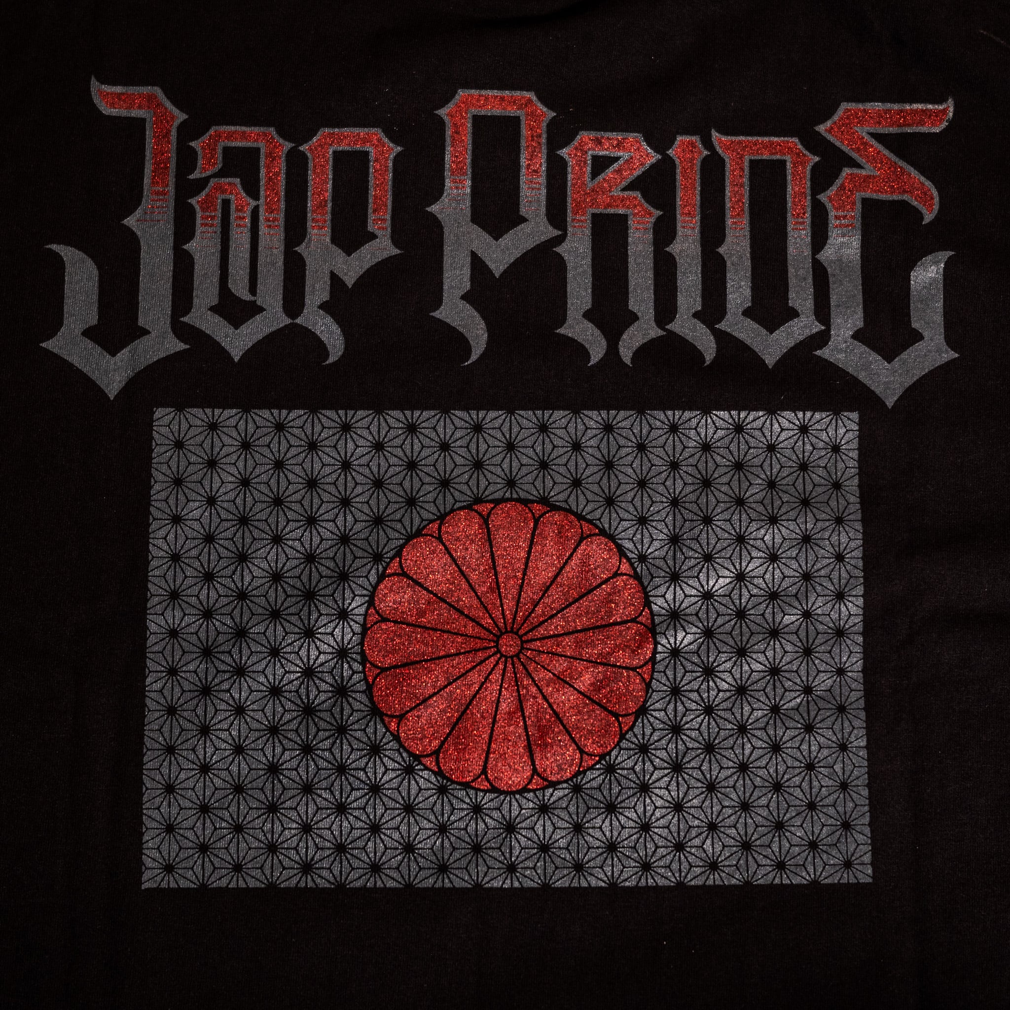 バックにはJap Prideと日本人共通シンボルの国旗をイメージして、日本が太古から大切にしてきた麻をリスペクトし、麻柄を合わせてあり、日の丸部分には菊家紋をグリッターカラーで合わせております。